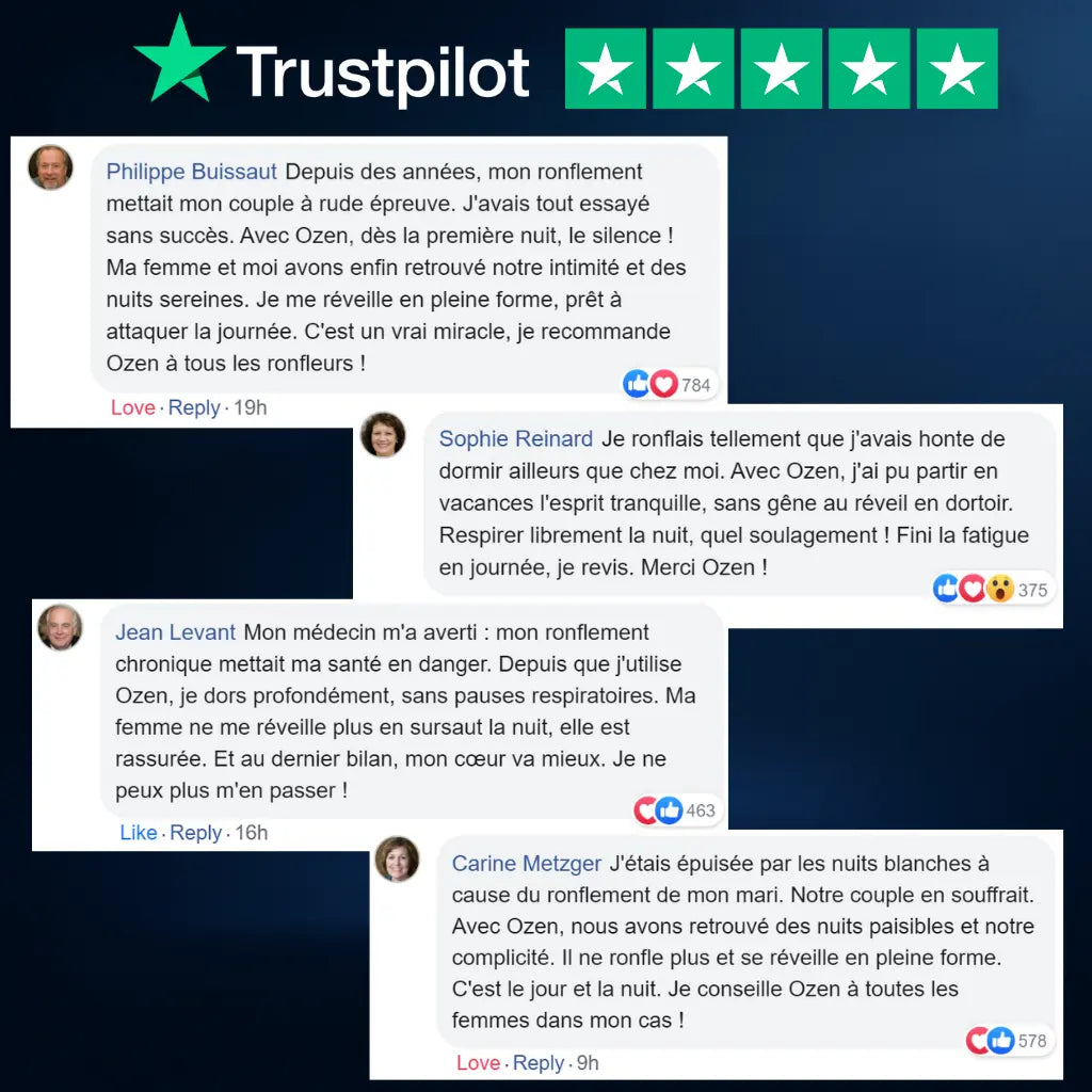 "On ne partait plus en vacances avec nos amis parce que j'avais honte des ronflements de mon mari dans les locations. Ça nous isolait socialement. J'ai commandé Ozen un peu par hasard. Résultat incroyable : en 6 semaines, plus aucun bruit la nuit. On a réservé un week-end en groupe le mois prochain pour la première fois en 3 ans. Mon mari a aussi plus d'énergie en journée."